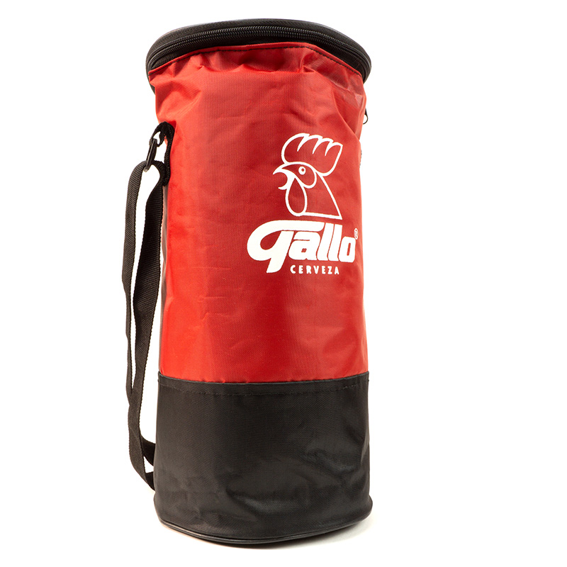 Hielera cilíndrica con interior plastificado impermeable con cierre de zipper, correa ajustable.